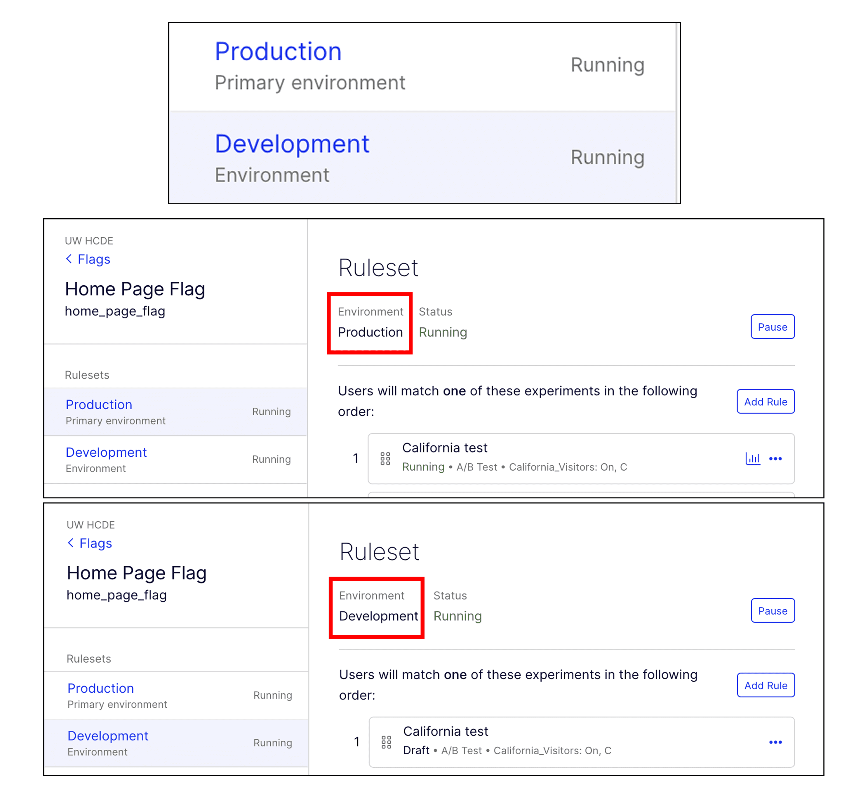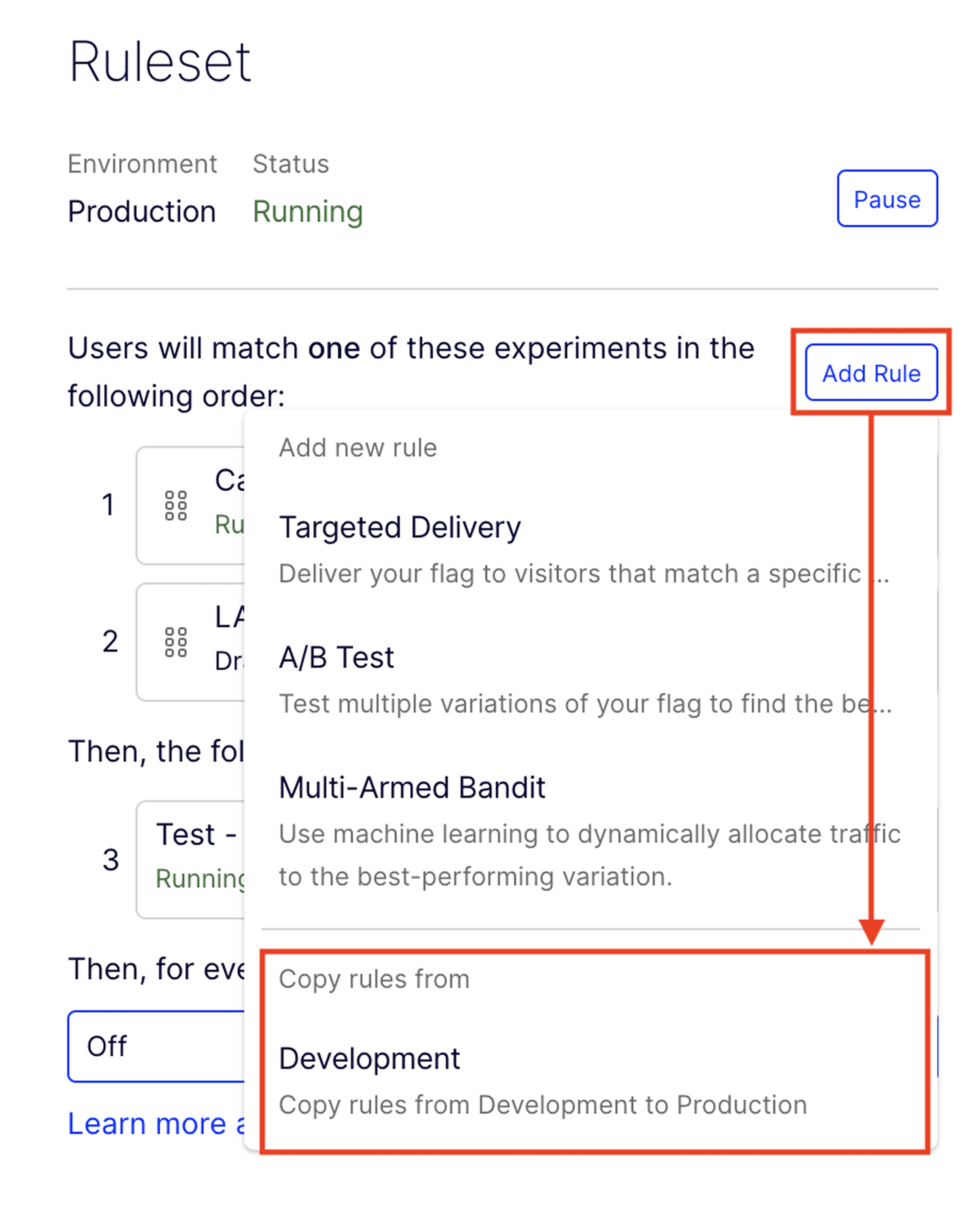 The "Copy Rule" feature, buried inside a dropdown under "Add Rule", was the intended path for transferring experiment setups from Development to Production. Almost no one found it without prompting. Users were also unsure what copying a rule would actually do, creating a second layer of uncertainty even after discovery.