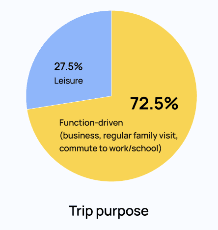 72.5% of trips are function-driven: commuting, business, regular family visits on a fixed schedule. For these passengers, information reliability is not a nice-to-have, but the main factor that affects their experience quality.